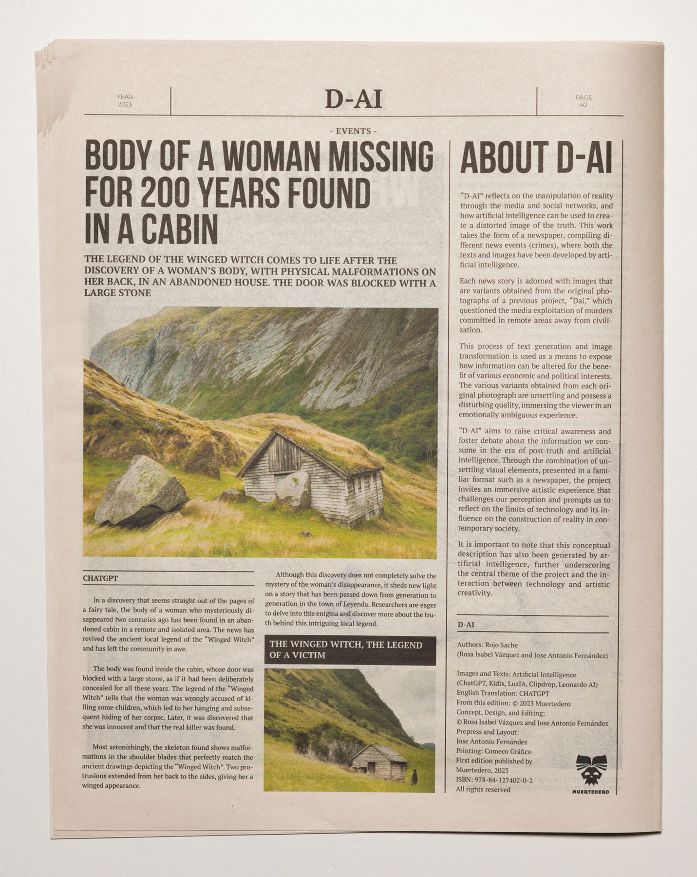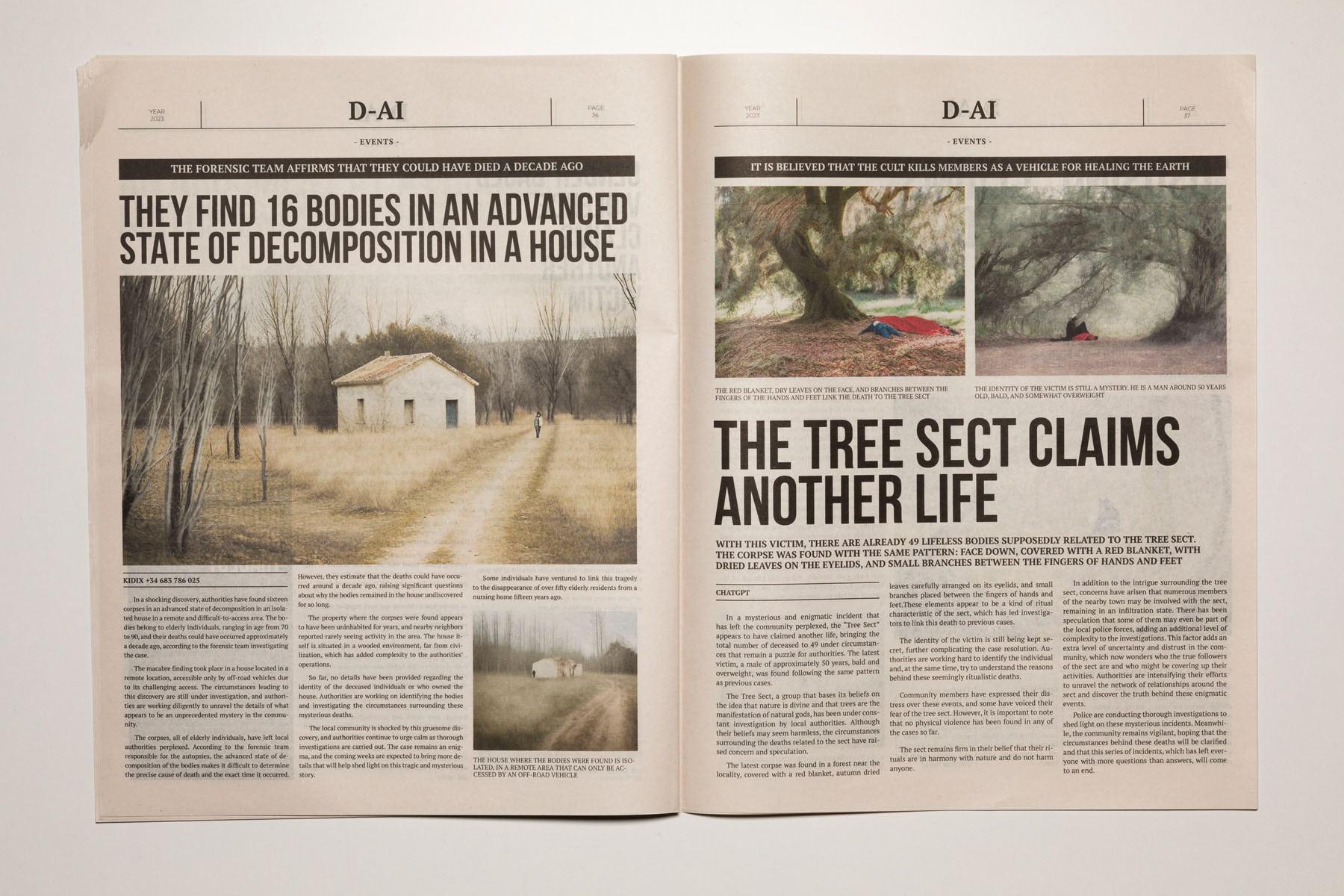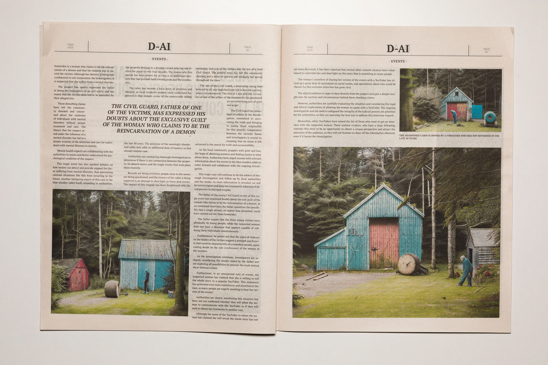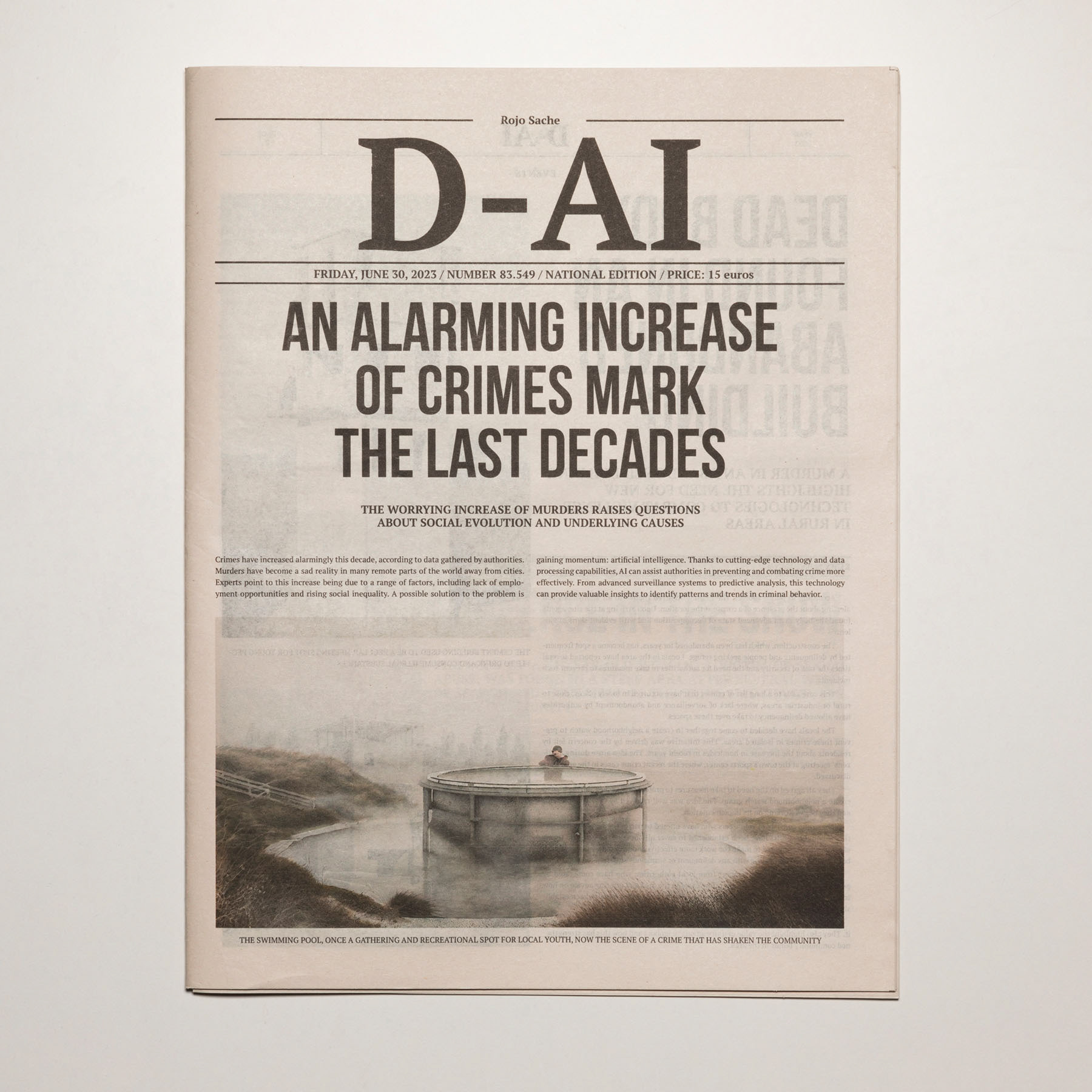 2023. The media are so conditioned by dominant interests and forces that it is increasingly difficult to distinguish between what is objective and what is manipulated. The emergence of artificial intelligence has only intensified this confusion, heightening the sense of uncertainty. D-AI seeks to address this issue and aims to foster a critical perspective, encouraging debate about the information we consume in the era of post-truth and artificial intelligence. It becomes essential to question where this alteration of the real is leading us. Building on an earlier Rojo Sache project, Dai, which examined the media exploitation of murders committed in remote landscapes, this new work takes the form of a newspaper that brings together various crime reports. Both the texts and the images—variants of the original photographs—have been generated using artificial intelligence, producing an alternative reality that is more unsettling, ambiguous and disturbing.