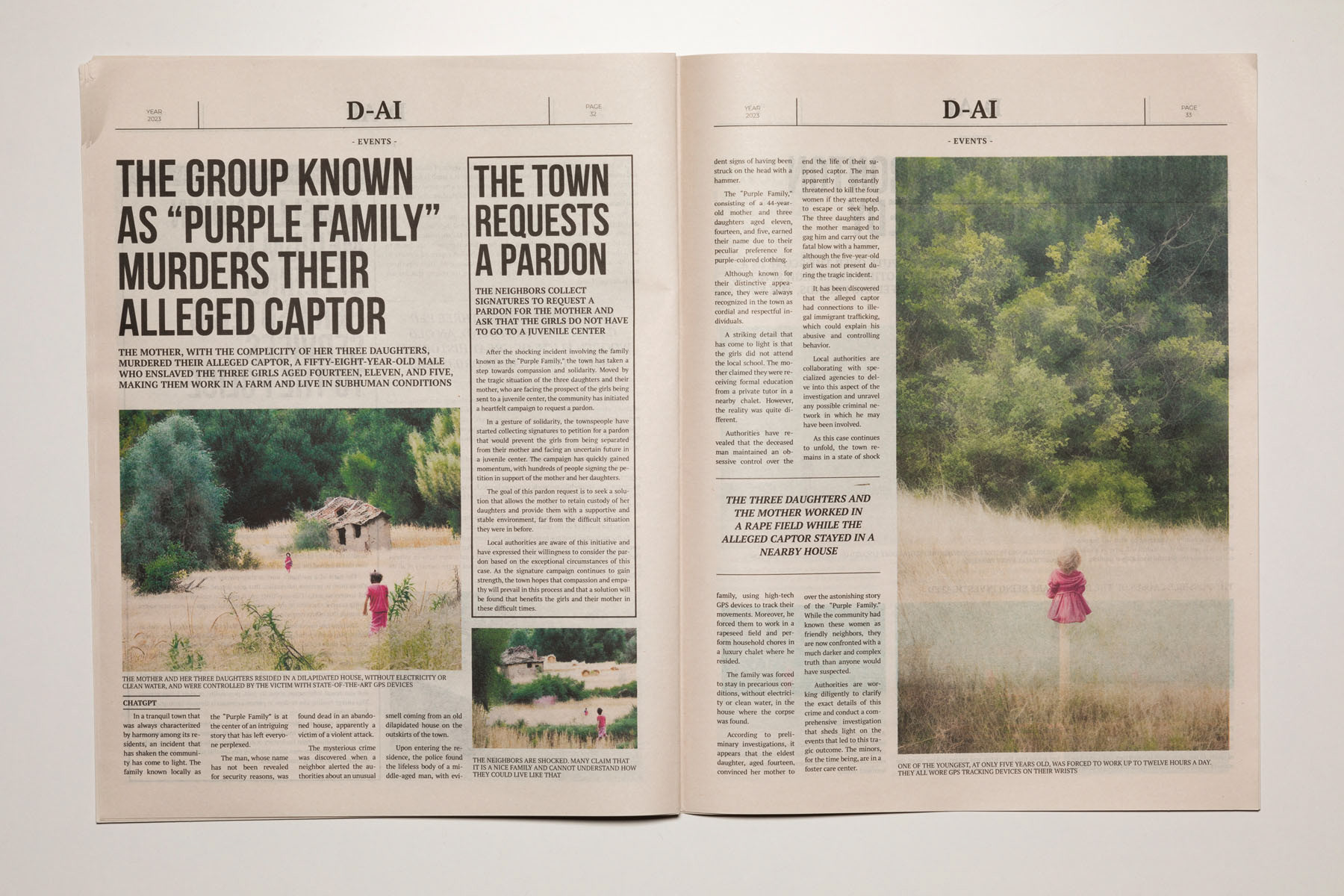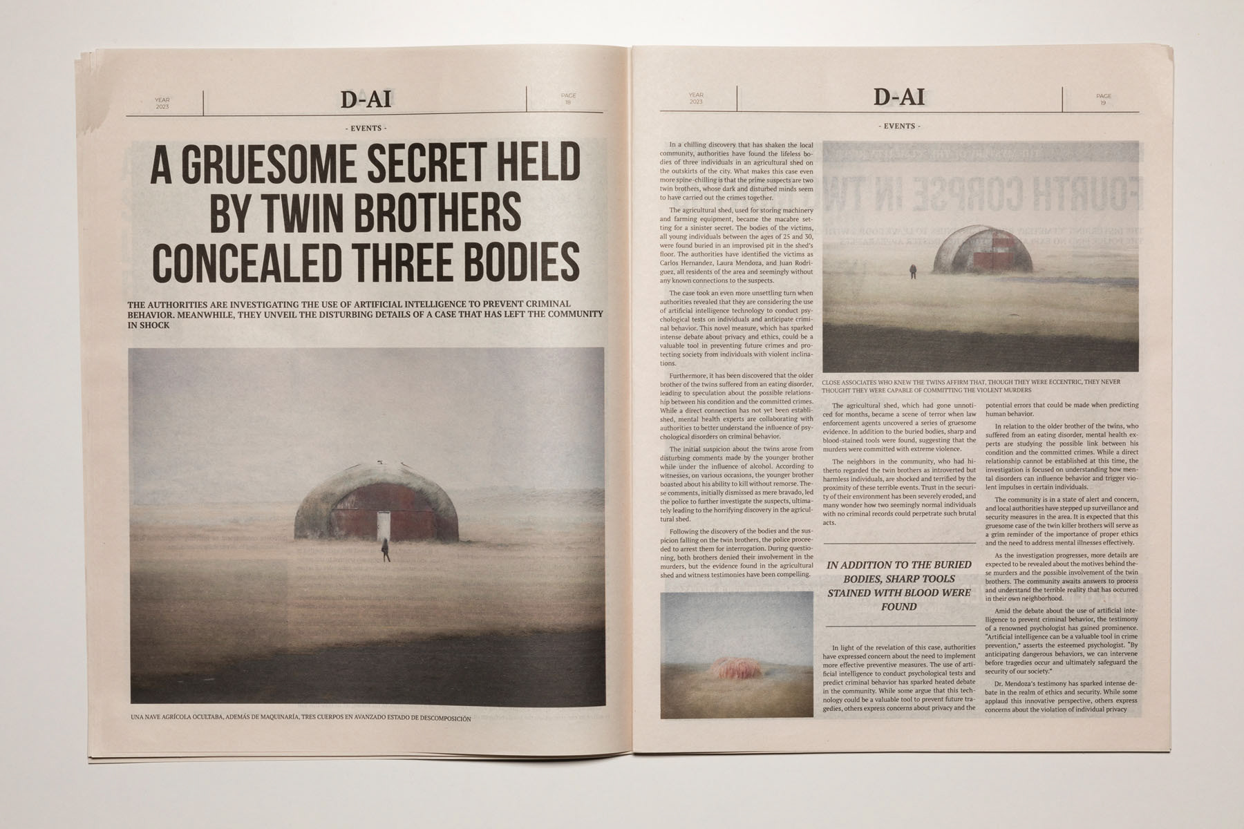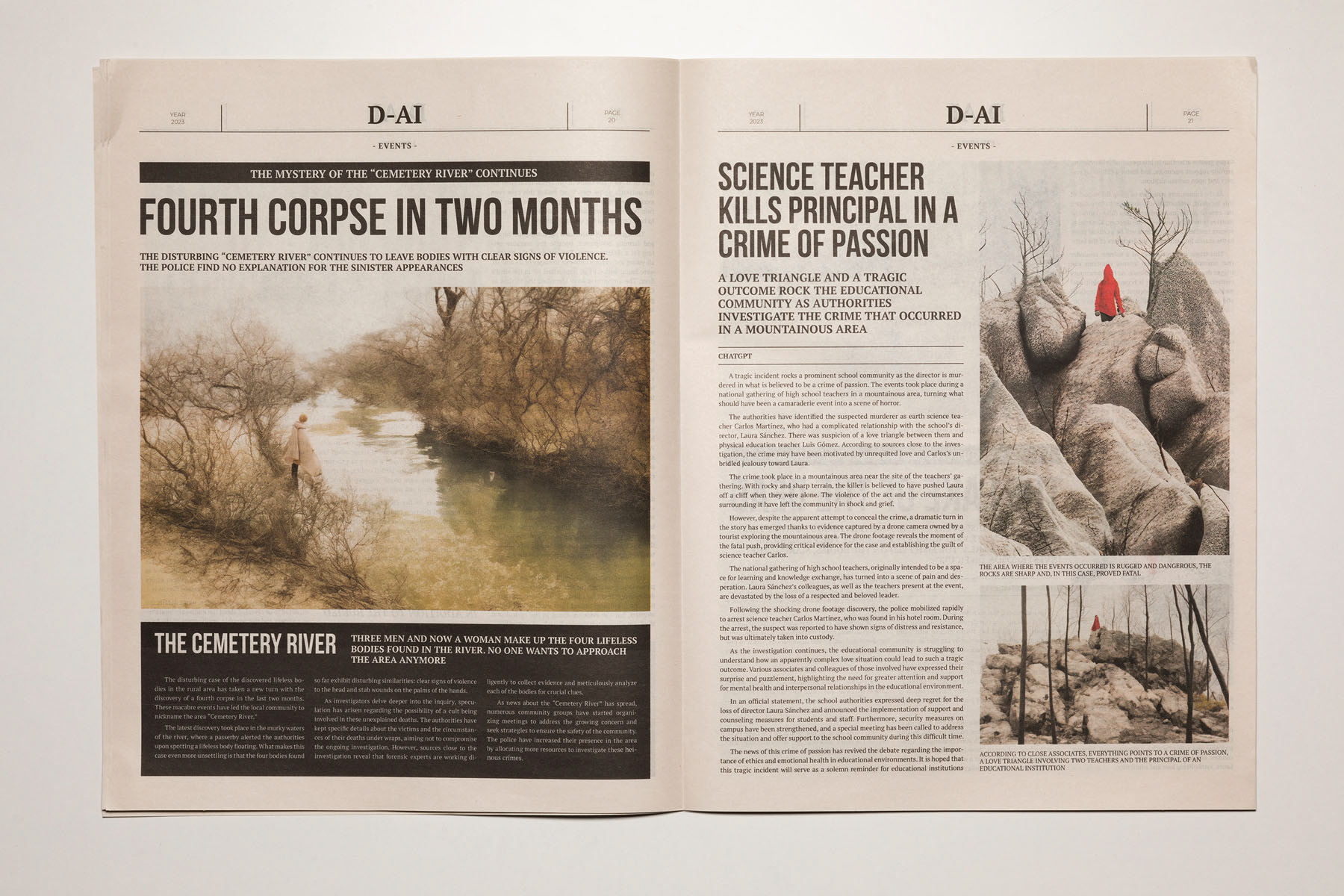 2023. The media are so conditioned by dominant interests and forces that it is increasingly difficult to distinguish between what is objective and what is manipulated. The emergence of artificial intelligence has only intensified this confusion, heightening the sense of uncertainty. D-AI seeks to address this issue and aims to foster a critical perspective, encouraging debate about the information we consume in the era of post-truth and artificial intelligence. It becomes essential to question where this alteration of the real is leading us. Building on an earlier Rojo Sache project, Dai, which examined the media exploitation of murders committed in remote landscapes, this new work takes the form of a newspaper that brings together various crime reports. Both the texts and the images—variants of the original photographs—have been generated using artificial intelligence, producing an alternative reality that is more unsettling, ambiguous and disturbing.