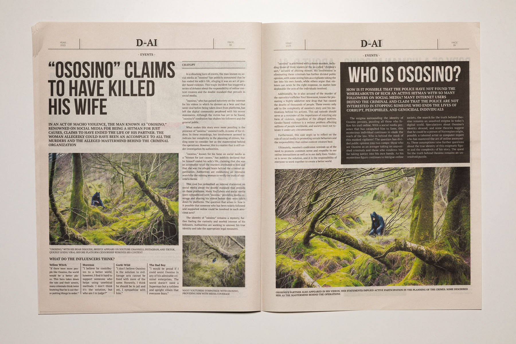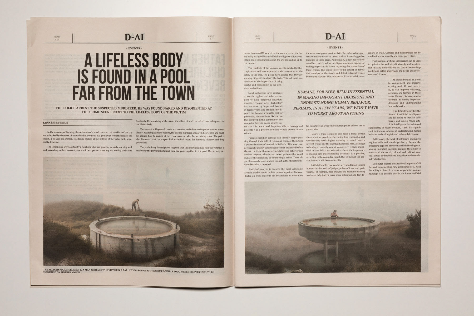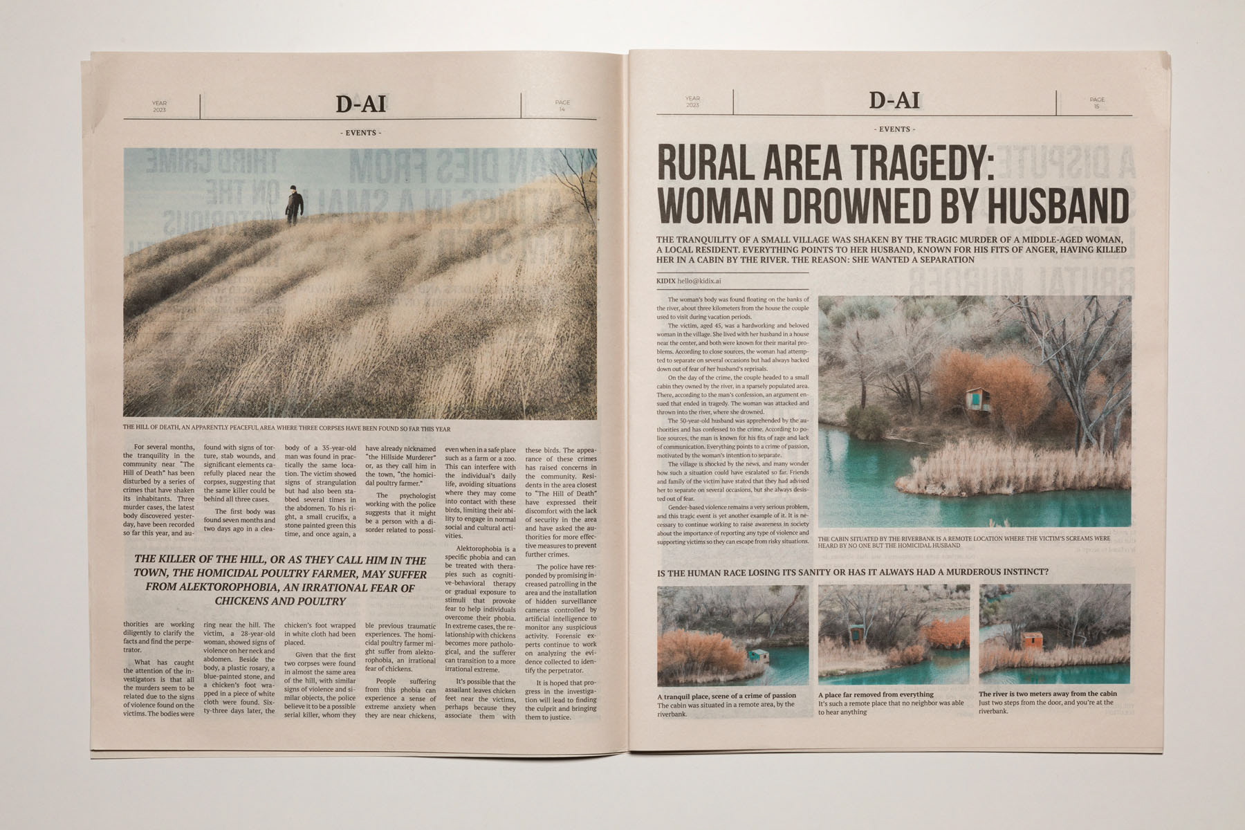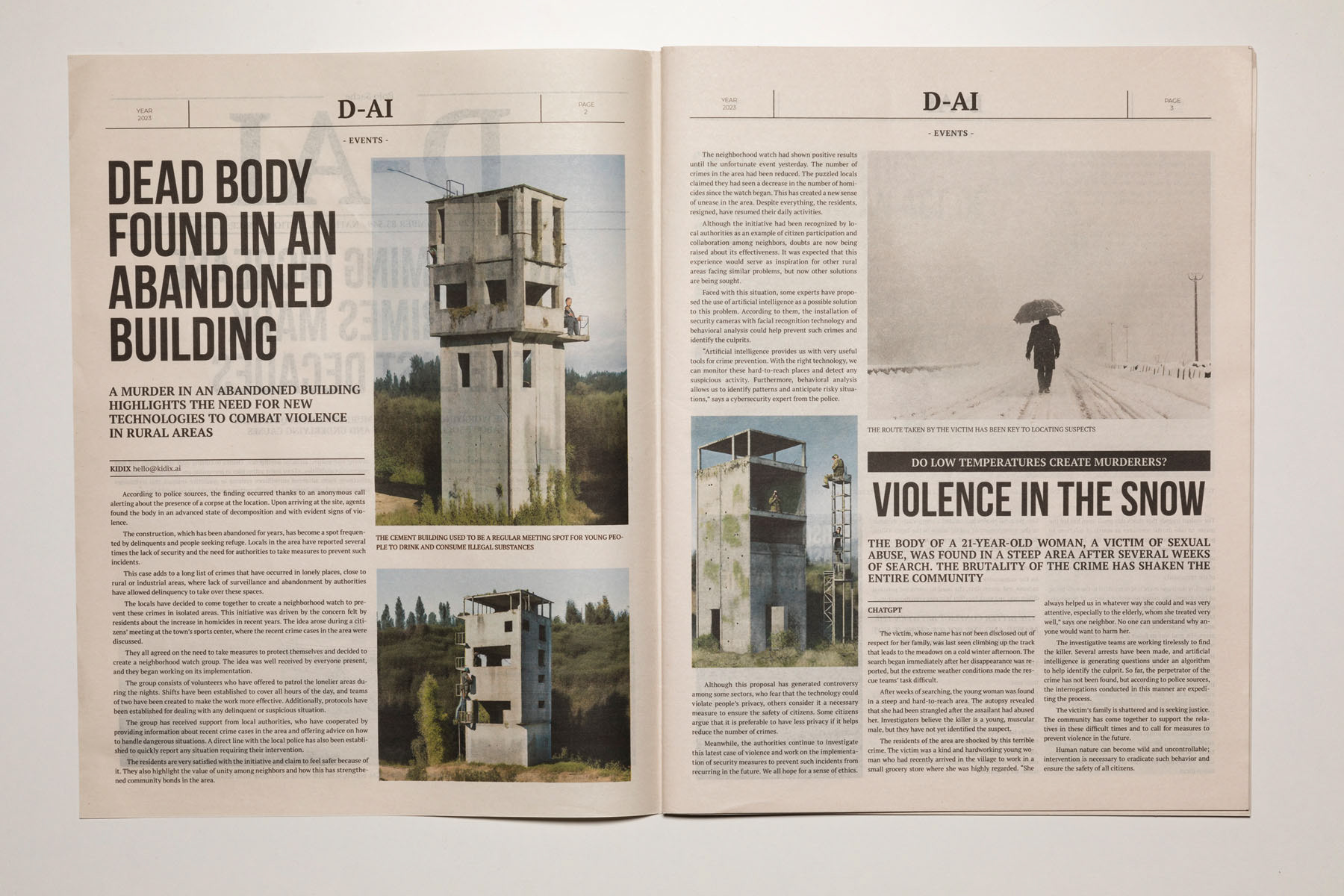2023. The media are so conditioned by dominant interests and forces that it is increasingly difficult to distinguish between what is objective and what is manipulated. The emergence of artificial intelligence has only intensified this confusion, heightening the sense of uncertainty. D-AI seeks to address this issue and aims to foster a critical perspective, encouraging debate about the information we consume in the era of post-truth and artificial intelligence. It becomes essential to question where this alteration of the real is leading us. Building on an earlier Rojo Sache project, Dai, which examined the media exploitation of murders committed in remote landscapes, this new work takes the form of a newspaper that brings together various crime reports. Both the texts and the images—variants of the original photographs—have been generated using artificial intelligence, producing an alternative reality that is more unsettling, ambiguous and disturbing.